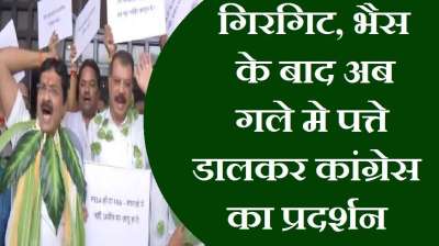 गिरगिट, भैंस के बाद अब गले में पत्ते डालकर कांग्रेस विधायकों का प्रदर्शन वन अधिकार पट्टे न देने का आरोप................