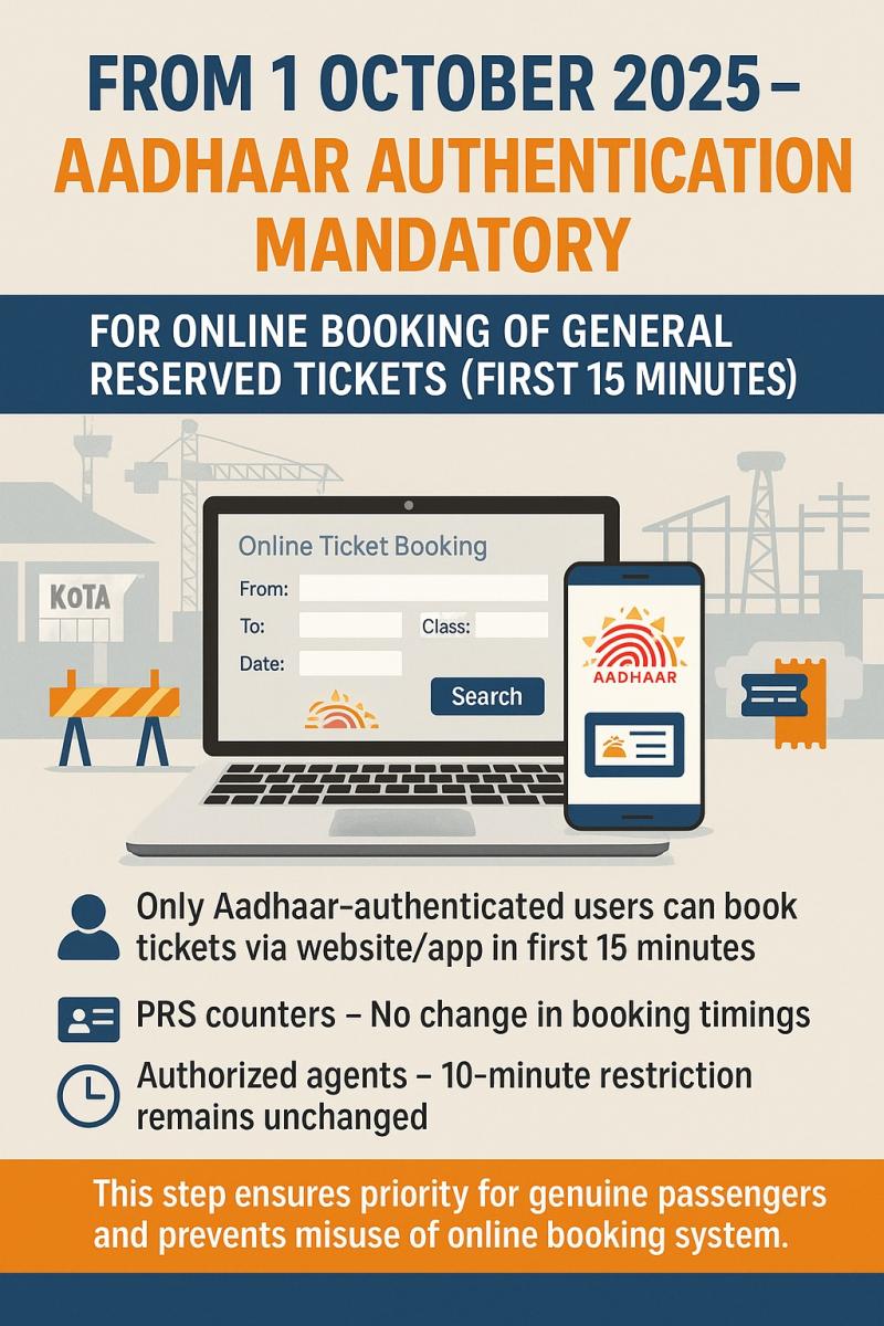 भोपाल। आरक्षण व्यवस्था का लाभ सबसे पहले आम उपयोगकर्ताओं तक पहुँचाने के लिए और बेईमान तत्वों द्वारा इस सुविधा के दुरुपयोग को रोकने के लिए, यह फैसला लिया गया है कि 01.10.2025 से, सामान्य आरक्षण खुलने के पहले 15 मिनट के दौरान, आरक्षित सामान्य टिकट, केवल आधार-प्रमाणित उपयोगकर्ता ही भारतीय रेलवे खानपान एवं पर्यटन निगम (आईआरसीटीसी) की वेबसाइट/इसके ऐप के ज़रिए बुक कर सकेंगे।