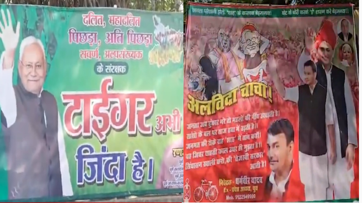 दरअसल, एग्जिट पोल के आंकड़ों में एनडीए को बहुमत दिखाया गया है। जिसके बाद एनडीए समर्थक काफी उत्साहित होकर पोस्टर लगाना शुरू कर दिया। एनडीए समर्थकों ने पोस्टर में लिखा- टाइगर अभी जिंदा है। नीतीश कुमार के नेतृव्य में एनडीए सरकार बनने का जिक्र किया। फिर क्या महागठबंधन दल ने भी अलविदा चाचा का पोस्टर लगाकर पलटवार किया है।