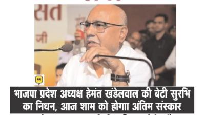 भाजपा प्रदेश अध्यक्ष हेमंत खंडेलवाल की पुत्री के निधन से राजनीतिक जगत शोकाकुल