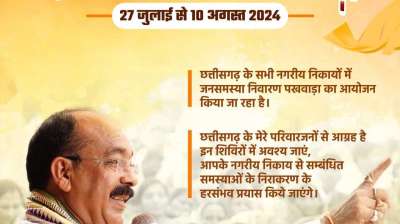 छत्तीसगढ़ के सभी नगरीय निकायों में शनिवार से जनसमस्या निवारण पखवाड़ा का आयोजन किया जाएगा, जो 10 अगस्त तक चलेगा। इस दौरान नगर निगमों, नगर पालिकाओं और नगर पंचायतों में...